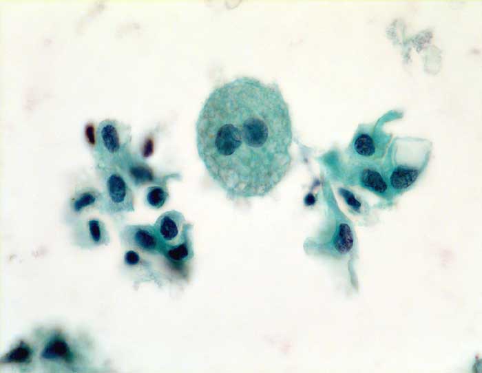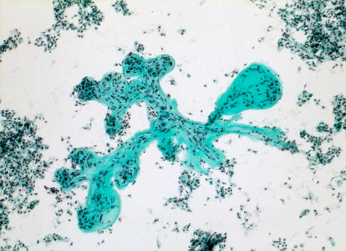 Papilläre Zellverbände oder Zellballen auf zystischem Hintergrund sprechen für eine papilläre Neoplasie. Feinnadelpunktate von papillären Neoplasien sind oft blutig. Gutartige Papillome gleichen zytologisch Fibroadenomen. Geringere oder fehlende Stromakomponente, Zystenbildung, Zellballen, Einblutung und klinische Präsentation in Form einer einseitigen hämorrhagischer Mamillensekretion sprechen für ein Papillom. Sowohl benigne als auch maligne papilläre Neoplasien können ein relativ blandes uniformes Zellbild zeigen. Papilläre Karzinome erscheinen oft monomorpher als gutartige Papillome. Hohe Zellularität, zahlreiche Einzelzellen und die Abwesenheit benigner Zellen (apokrine Zellen, Myoepithelien) sprechen eher für ein papilläres Karzinom. Meist handelt es sich dabei um nicht invasive intraduktale Karzinome.