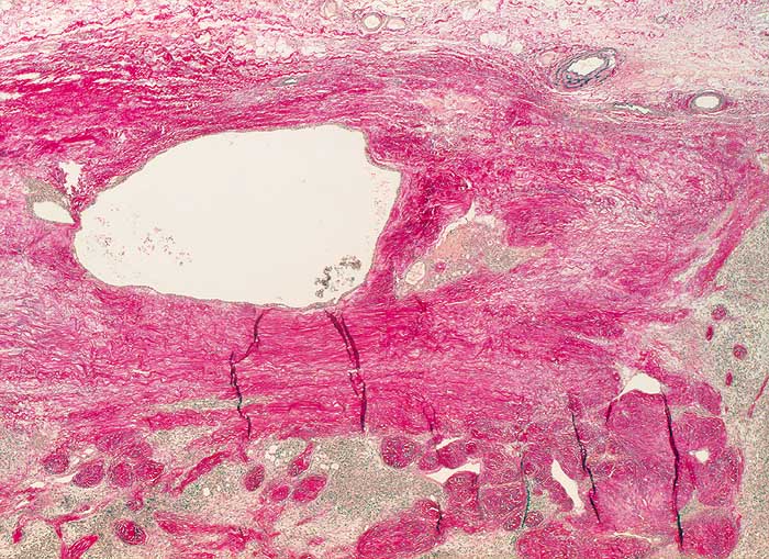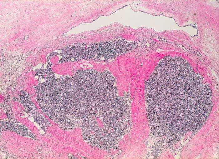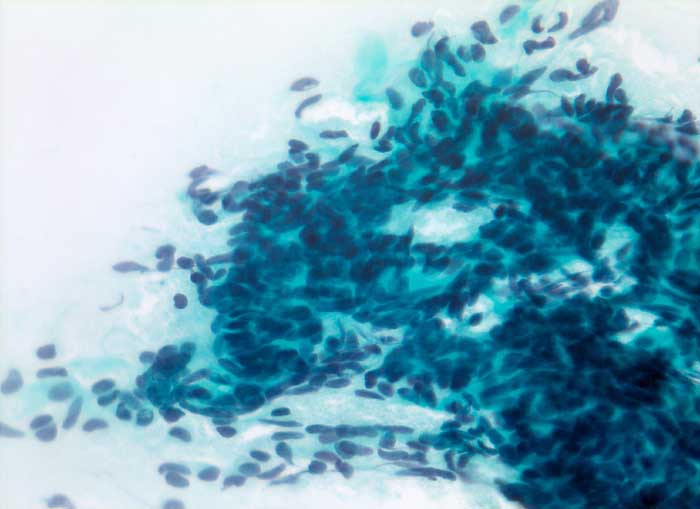 Der zytologische Befund von epithelialen Thymustumoren ist abhängig vom histologischen Subtyp. Die Einteilung der Thymome nach WHO umfasst die Typen A, AB, B1, B2, B3 und Typ C (Thymuskarzinom). Die Subtypen unterscheiden sich bezüglich Morphologie und Atypiegrad der epithelialen Zellen und in der Menge der beigemischten unreifen T Lymphozyten. Unten gezeigt wird ein Thymom vom Typ A (medulläres Thymom). Die Ausstriche enthalten bei diesem Subtyp monotone Spindelzellen mit feingranulierten Kernen ohne Atypien und nur wenige Lymphozyten. Ein Teil der Spindelzellen kann positiv sein für den B-Zell Marker CD20. Die unreifen T-Lymphozyten sind positiv für CD1a, CD99 und TdT.