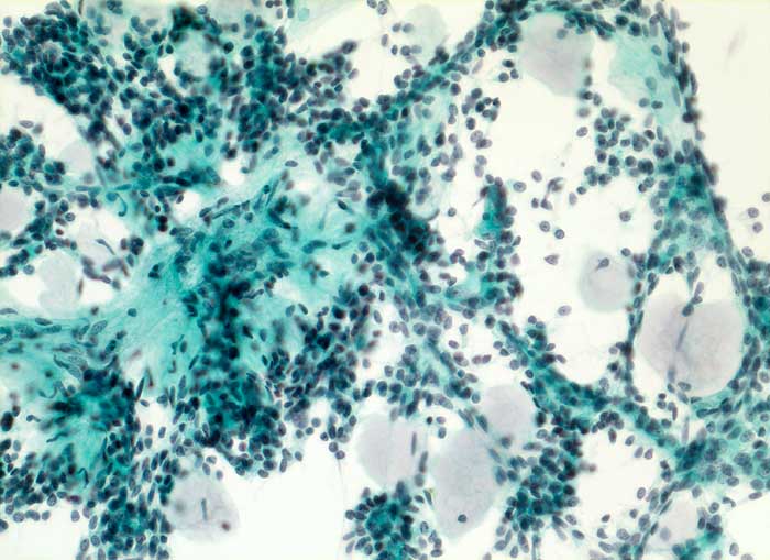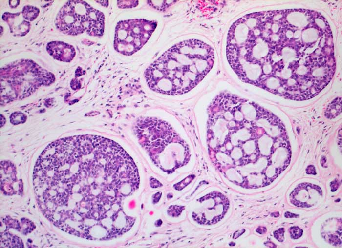 Das adenoidzystische Karzinom tritt bevorzugt in Speicheldrüsen, seltener auch in den unteren Luftwegen oder in der Mamma auf. Die Zellen des adenoidzystischen Karzinoms bilden zusammenhängende flach ausgebreitete Verbände, die teilweise kugelförmige Matrix umschliessen. Der Nachweis dieser homogenen Matrixkugeln erlaubt die Abgrenzung vom pleomorphen Adenom (fibrilläre Matrix) und vom Basalzelladenom (irregulär geformte Matrixpartikel). Die kleinen monomorphen Tumorzellen können täuschend gutartig aussehen. Die Zellkerne sind angulär und hyperchromatisch, das Chromatin ist feinkörnig und geringgradig verdichtet. Der schmale Zytoplasmasaum ist blass eosinophil.