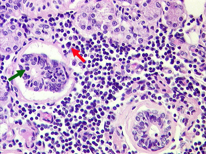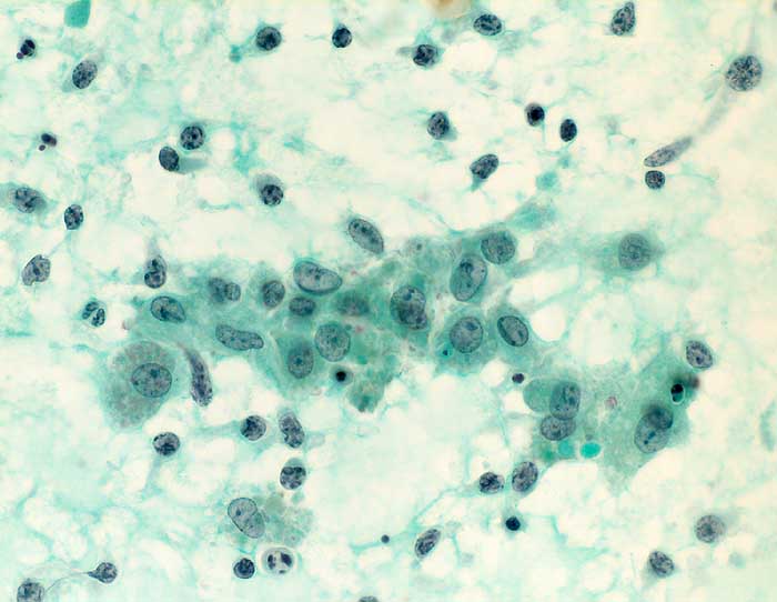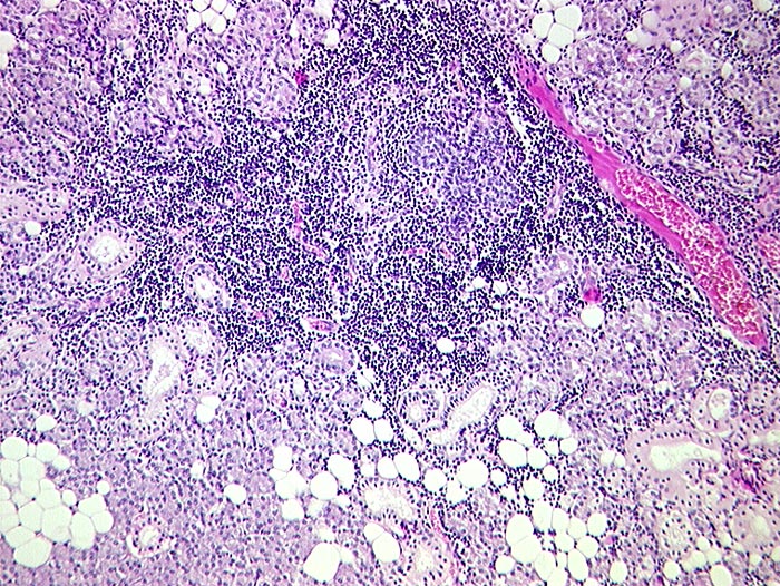 Das Zellbild ist je nach Stadium mehr oder weniger zellreich und zusammengesetzt aus Lymphozyten, Myoepithelien und selten Azinuszellen. Ein lymphozytäres Zellbild ist in Kombination mit dem typischen klinischen Bild (Keratokonjunktivitis sicca, Xerostomie, rheumatische Erkrankung) für die Sicherung der Diagnose ausreichend. Auf die Lippenbiopsie kann in diesem Fall verzichtet werden.