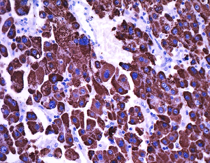 Nicht neoplastische Hepatozyten sind diffus positiv. Regenerative Knoten zeigen eine heterogene Anfärbung. Normale Dünndarmschleimhaut kann fokal stark positiv sein. Alle anderen Normalgewebe sind negativ.