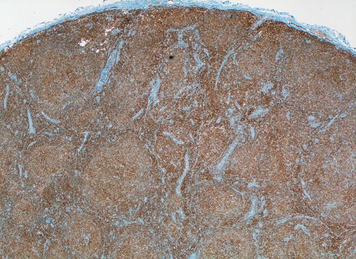 Das bcl-2 Protein ist ein Apoptose Inhibitor. Bcl-2 wird von kleinen Lymphozyten der normalen Mantelzone und von vielen T-Zellen exprimiert. Normale und reaktive Keimzentren sind negativ für bcl-2. Viele Zellen im Thymusmark aber nur wenige in der Thymusrinde exprimieren bcl-2.