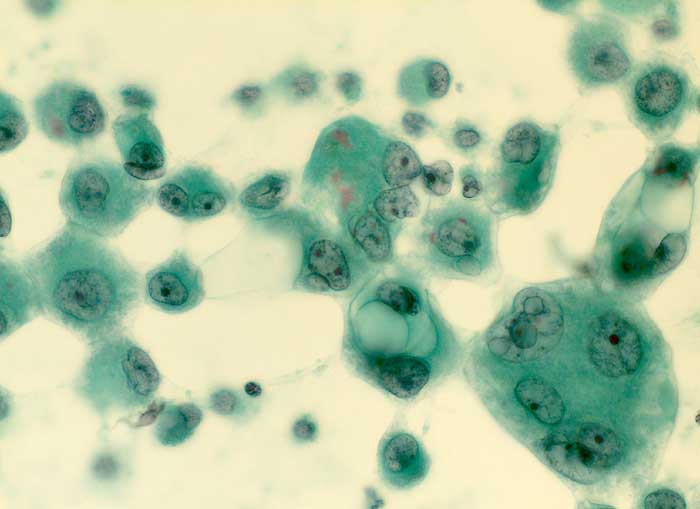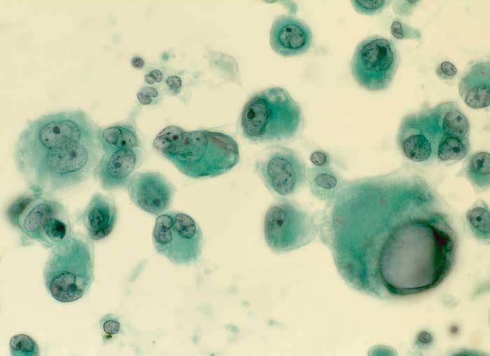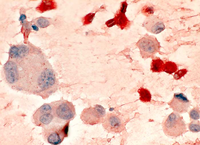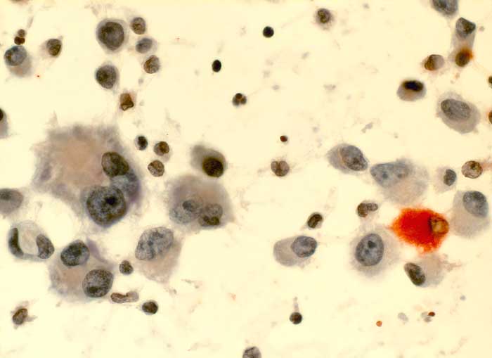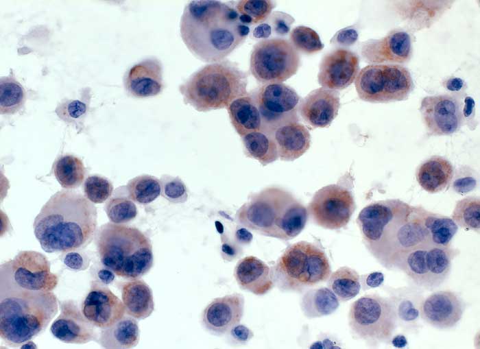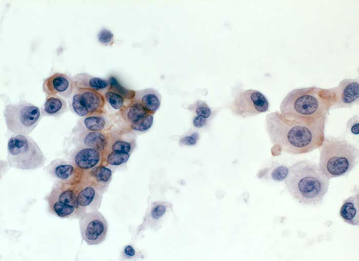 Folgendes Antikörperpanel eignet sich für die Bestätigung der Verdachtsdiagnose einer Pleurakarzinose eines primären Bronchuskarzinoms: BerEP4 (Adenokarzinom positiv), TTF1 (Lungen- und Schilddrüsenkarzinom positiv), Calretinin (Mesothelien positiv) und Vimentin (Mesothelien positiv).