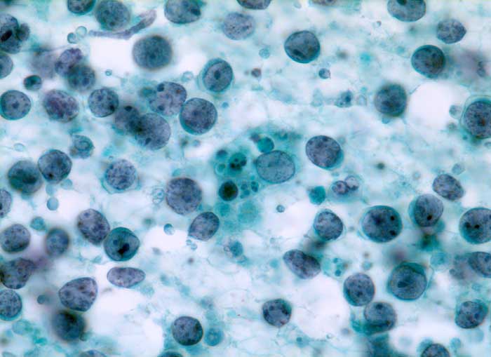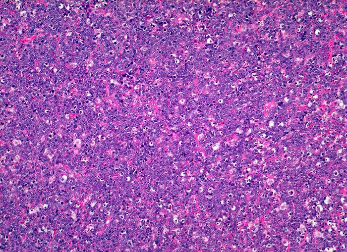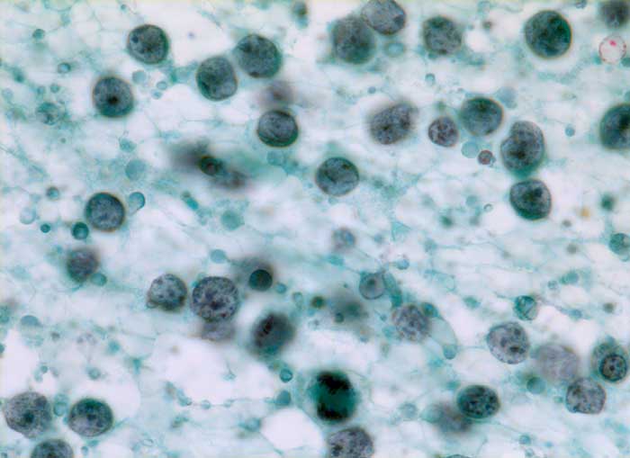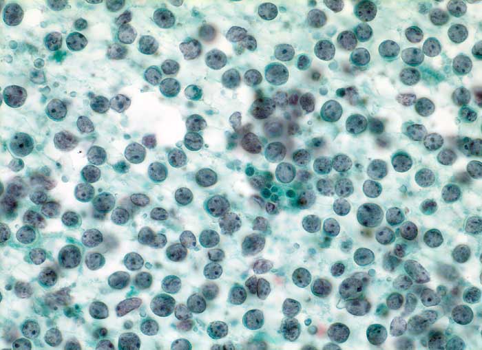 Die Zellen des Burkitt Lymphoms sind mittelgross und die rundlichen Kerne besitzen 2 bis 5 basophile Chromozentren. Der Kernhintergrund ist auffallend hell. Das Zytoplasma ist mittelbreit und basophil. Der Ausstrichhintergrund enthält lymphoglanduläre Körperchen und viele Kerntrümmermakrophagen. Kerntrümmermakrophagen sind also kein verlässliches Zeichen für die Benignität eines Befundes. Entsprechend der sehr hohen Proliferationsrate sind gegen 100% der Tumorzellen Ki67/Mib1 positiv. Eine geringere Proliferationsrate spricht gegen die Diagnose eines Burkitt Lymphoms.