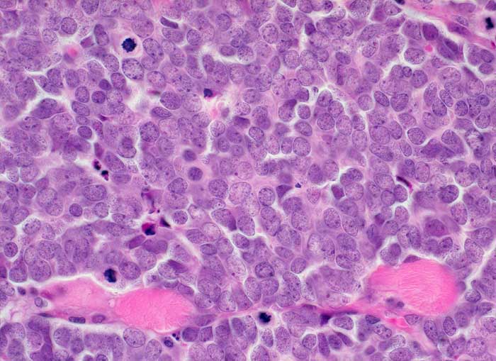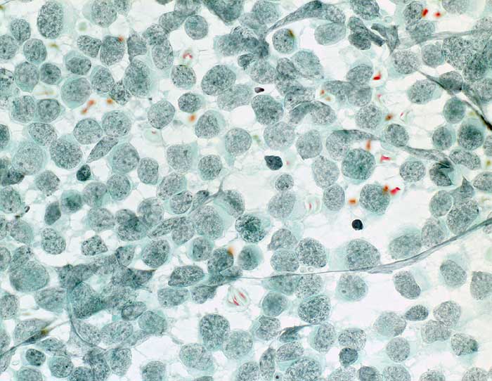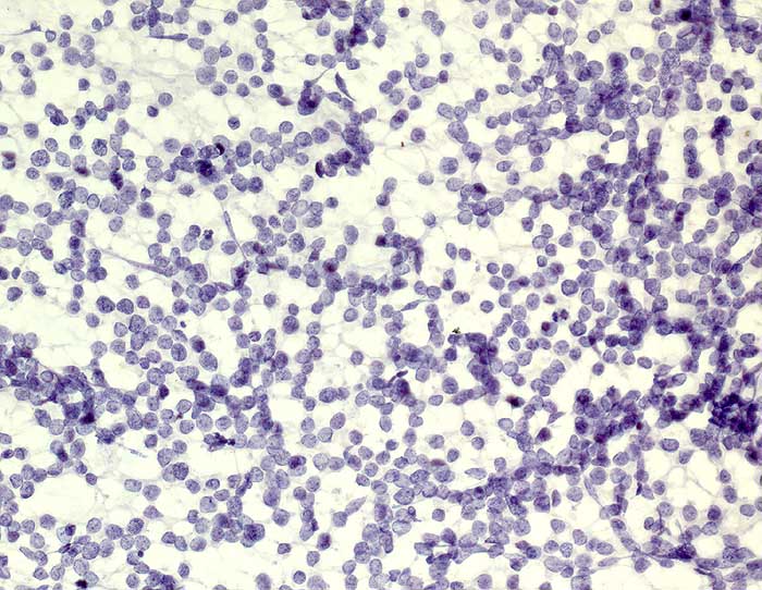 Das Merkelzellkarzinom ist ein neuroendokrines Karzinom ausgehend von den Merkelzellen der Haut. Die Ausstriche sind zellreich. Die monomorphen zytoplasmaarmen Zellen liegen einzeln oder in lockeren Verbänden. Die Kerne sind fragil, rund bis oval und hyperchromatisch. Das Chromatin zeigt ein Pfeffer und Salz Bild. Die Unterscheidung von der Metastase eines kleinzelligen Bronchuskarzinoms oder von einem Lymphom kann immunzytochemisch erfolgen. Merkelzellkarzinome zeigen eine charakteristische punktförmige zytoplasmatische Positivität für CK20 und sind negativ für TTF1, BerEP-4 und CD45.