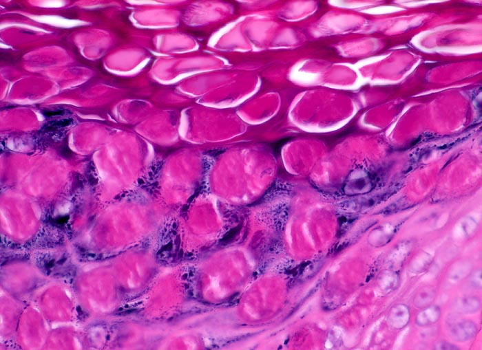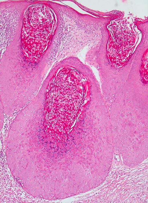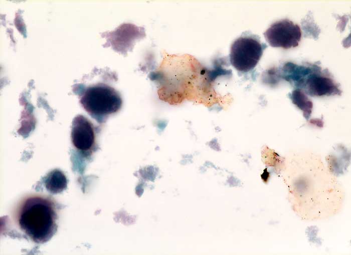 In der Regel findet man im Ausstrich Detritus vermischt mit neutrophilen Granulozyten, ausgereifte und parakeratotische Plattenepithelien. Diagnostisch wegweisend sind die teils intra- teils extrazellulären, rundlichen bis ovalen Einschlusskörper. Die Kerne der befallenen Zellen sind kaum zu sehen. Wenn wie im vorliegenden Fall ausschliesslich Zellen mit Kerneinschlüssen vorhanden sind, kann der Befund als maligner Tumor fehlgedeutet werden. Die fehlende Chromatinstruktur der homogenen Einschlüsse führt in diesem Fall zur richtigen Diagnose.