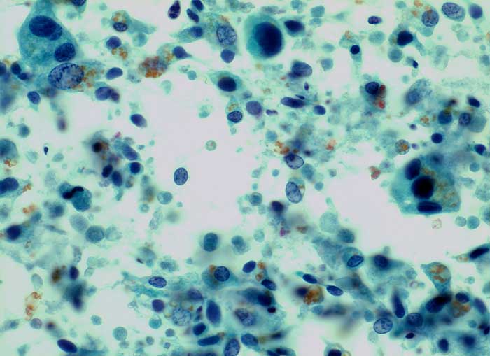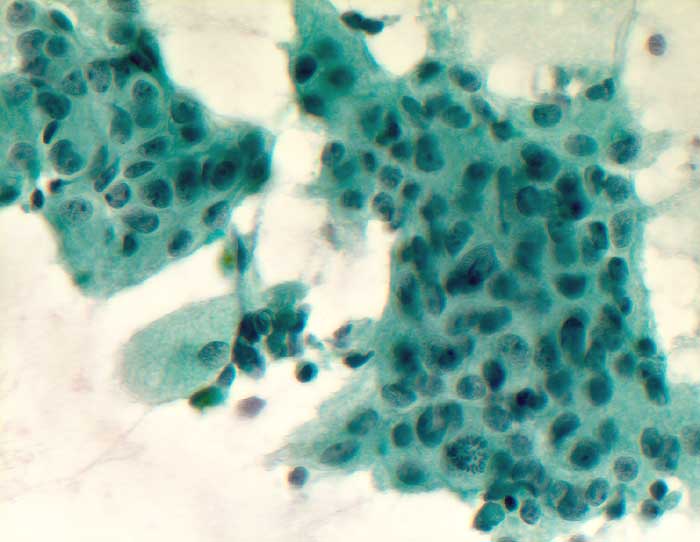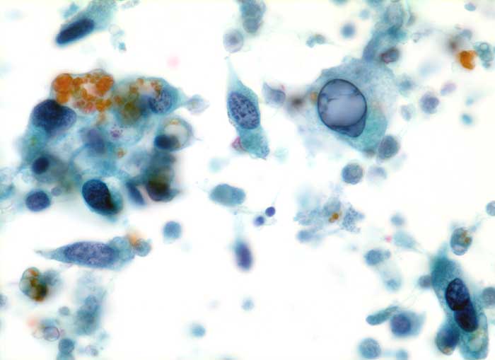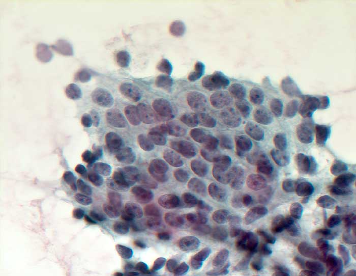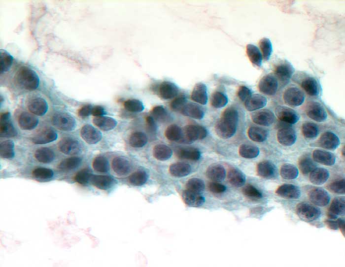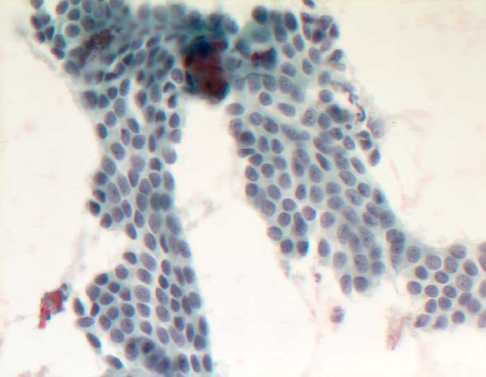 Die zytologische Diagnose des Prostatakarzinoms bereitet in der Regel keine grossen Schwierigkeiten. Die Karzinomzellen sind etwas grösser als normale Prostataepithelien. Die Kerne sind wenig grob strukturiert und ziemlich monomorph. Die Kern-Zytoplasma Relation ist erhöht. Nukleolen, die bereits bei 100 facher Vergrösserung gut sichtbar sind, stellen ein wichtiges Malignitätskriterium dar. Im Übrigen hängt das zytologische Bild von der Differenzierung des untersuchten Tumors ab.