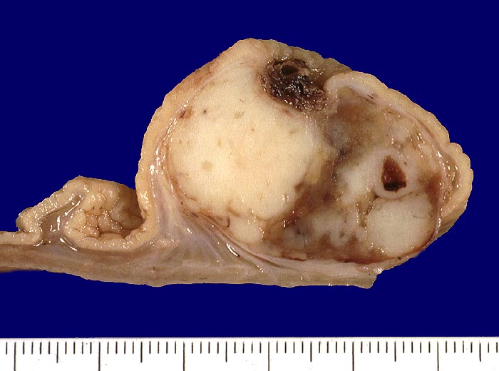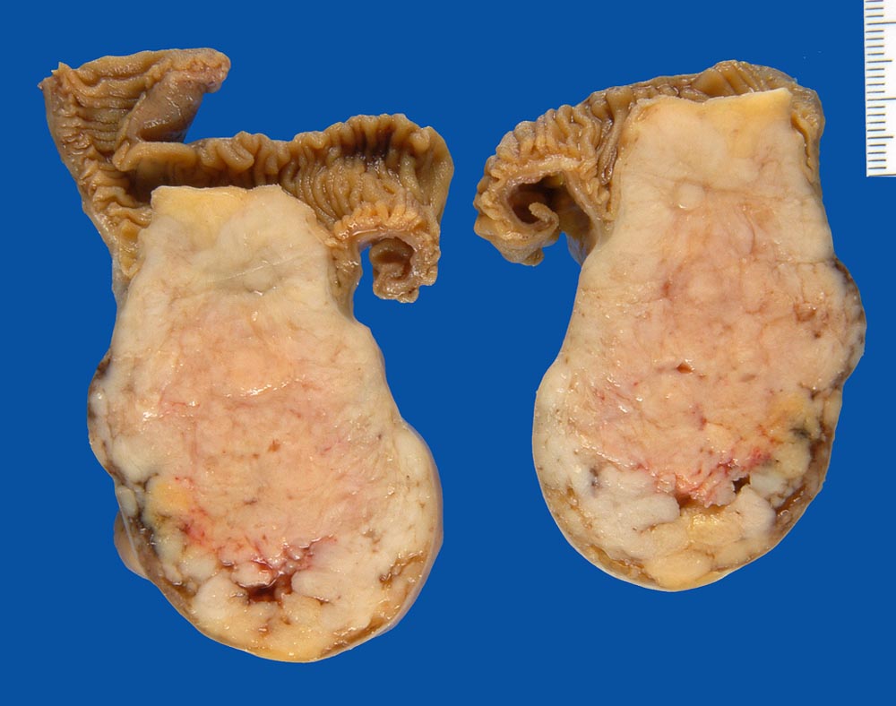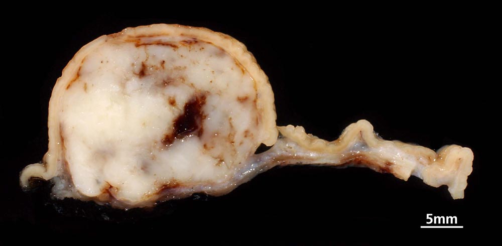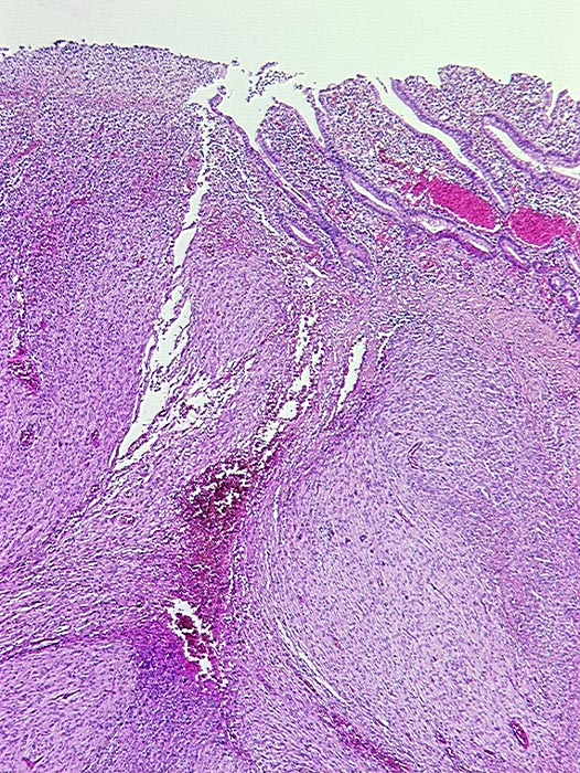 Makroskopisch imponieren kleine Tumoren als peritoneale, intramurale oder submuköse Knoten. Grössere Tumoren wölben sich oft vor und können ulzerieren. Die Schnittfläche ist weisslich und kann Einblutungen, Zysten, Fibroseareale oder Nekrosen aufweisen. Histologisch werden Spindelzelltyp (70%), Epitheloidzelltyp (20%) oder gemischtzelliger Typ (10%) unterschieden. Der histologische Subtyp scheint keinen Zusammenhang mit zugrundeliegender Mutation, Therapieansprechen und Prognose zu haben. Gelegentlich sind vor allem die kleineren Tumoren zellarm und kollagenreich.