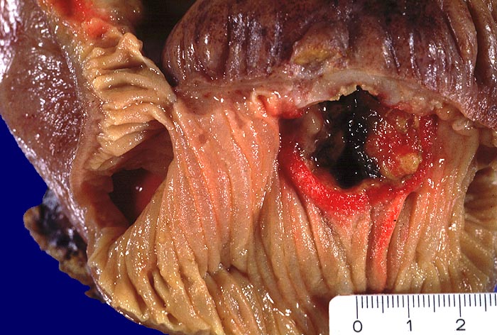 • Über dem Tumor entzündungsfreie Antrumschleimhaut mit partiell reepithelialisiertem oberflächlichem Ulkus (Quellungsfibrinoid).