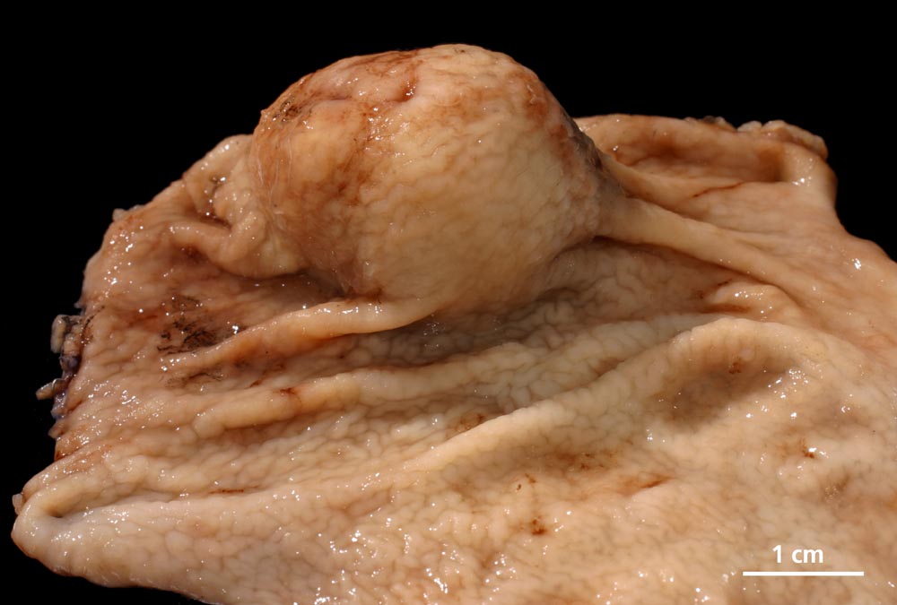 • Scharf begrenzter kugeliger Tumor in der Submukosa des Magenantrums