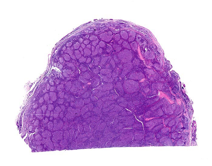 • Dichtstehende monotone neoplastische Follikel in Rinde und Mark (follikuläres Wachstumsmuster).