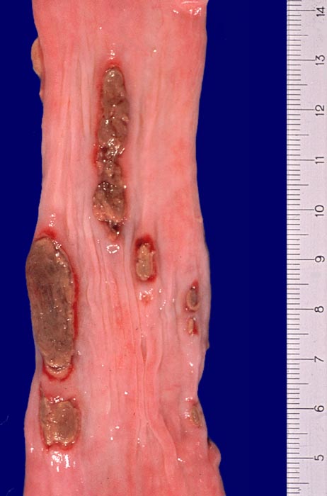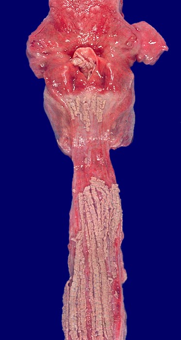 Endoskopisch finden sich abstreifbare weissgelbe krümelige Plaques, welche keine Prädilektionsstelle zeigen. Die Schleimhaut kann erodiert oder ulzeriert sein. In Klumpen von nekrotischen Plattenepithelzellen lassen sich mikroskopisch oft Sporen und Pseudohyphen nachweisen. Die Pseudohyphen wachsen oft senkrecht zur Epitheloberfläche. Besonders gut sichtbar werden die Pilze in der PAS oder Grocott Färbung. Zusätzlich besteht eine aktive Ösophagitis mit Infiltration der oberflächlichen Plattenepithelschicht durch neutrophile Granulozyten. Zahlreiche neutrophile Granulozyten in einem Ulkus weisen auf eine Soorösophagitis. Bei viral bedingten Ulzera (Herpes, CMV) prädominieren Makrophagen.