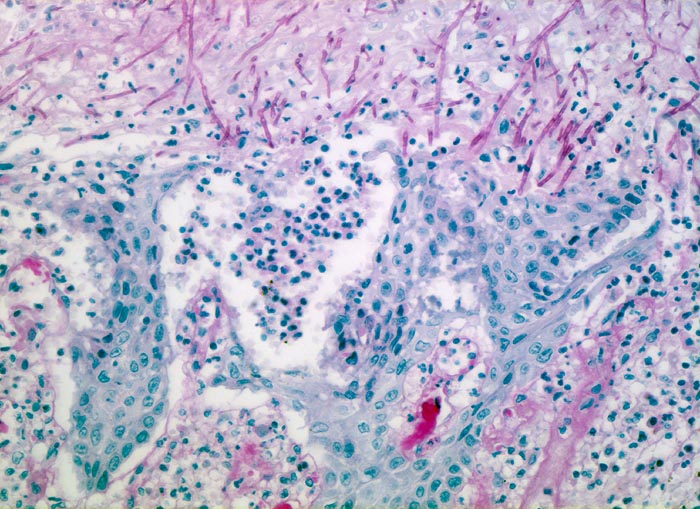 Die Pseudohyphen infiltrieren das Plattenepithel.