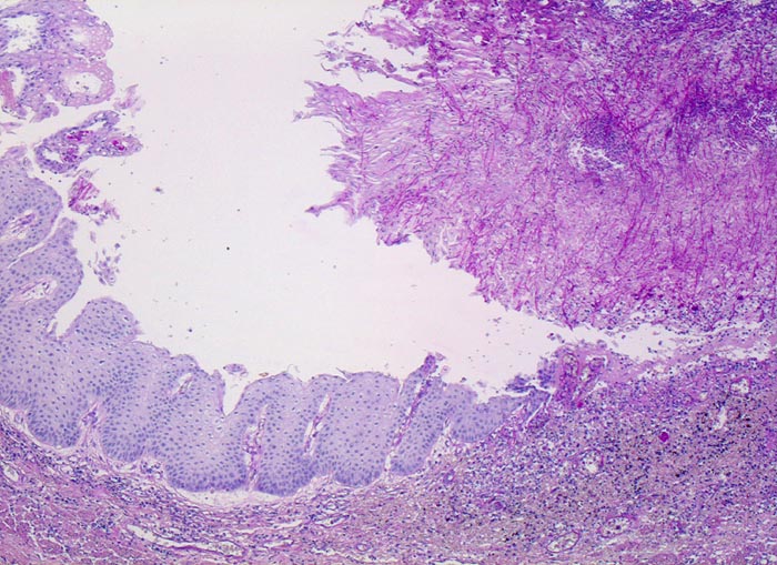 Die Pseudomembran über der ulzerierten Schleimhaut setzt sich zusammen aus einem dichten Netzwerk PAS positiver Soorpseudohyphen und ovale aussprossende Sporen, nekrotischem Plattenepithel, Fibrin und neutrophilen Granulozyten.