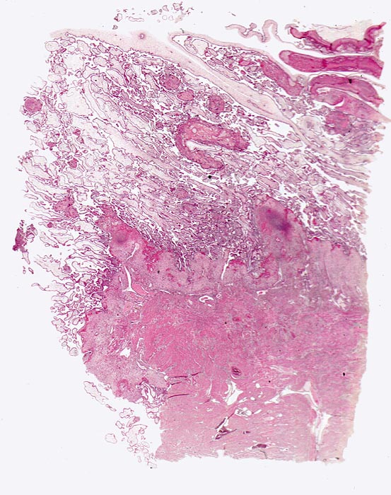 Chorionzotten, ein Teil davon verankert mit dem dezidual transformierten Endometrium = Dezidua basalis (Haftzotten).