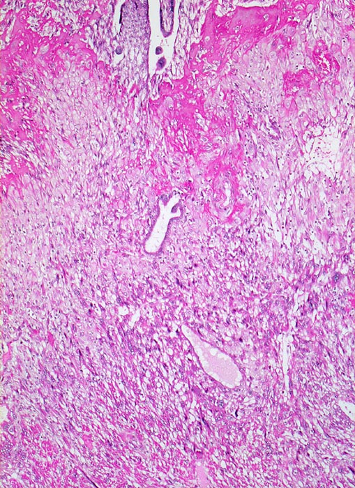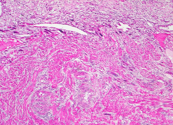 Myometrium bedeckt von dezidualisiertem Endometriumstroma der Dezidua basalis.