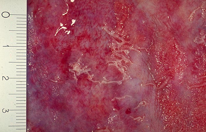 Morphologisch unterscheidet man folgende Formen: seröse Perikarditis (rheumatisches Fieber, Virusinfekt, Kollagenosen), fibrinöse Perikarditis (Urämie, rheumatisches Fieber, Myokardinfarkt), eitrige Perikarditis (Bakterien, Pilze, Parasiten), hämorrhagische Perikarditis (> 71) (Tumor, Tuberkulose, Trauma, Urämie), konstriktive Perikarditis (Bakterien, Tuberkulose). Im frühen Stadium ist das Perikard hyperämisch und erscheint herdförmig matt (> 296). Bei einer serofibrinösen Entzündung liegen gelbweisse netzförmig verzweigte Fäden oder Zotten von Fibrin auf parietalem und viszeralem (=Epikard) Blatt des Perikard. Anfänglich sind die Beläge gut abstreifbar. Nach einigen Tagen haftet das Fibrin auf der Unterlage als Folge der Organisation durch Granulationsgewebe. Als Folge dieser Organisationsvorgänge können die Perikardblätter miteinander verkleben und verwachsen.