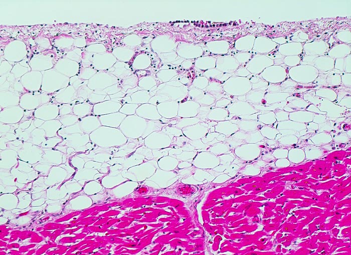 • Eingebettet in das epikardiale Fettgewebe ein Koronararterienast (Querschnitt).