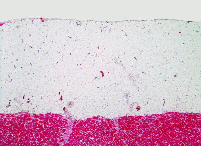 • Unterhalb der Granulationsgewebszone epikardiales Fettgewebe auf unverändertem Myokard.