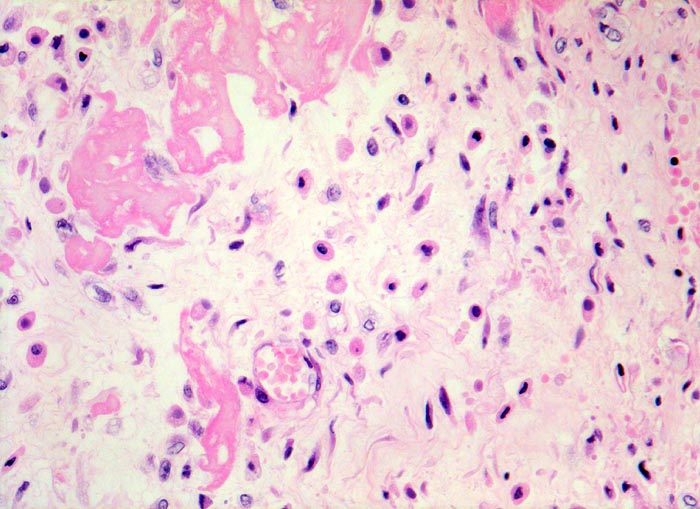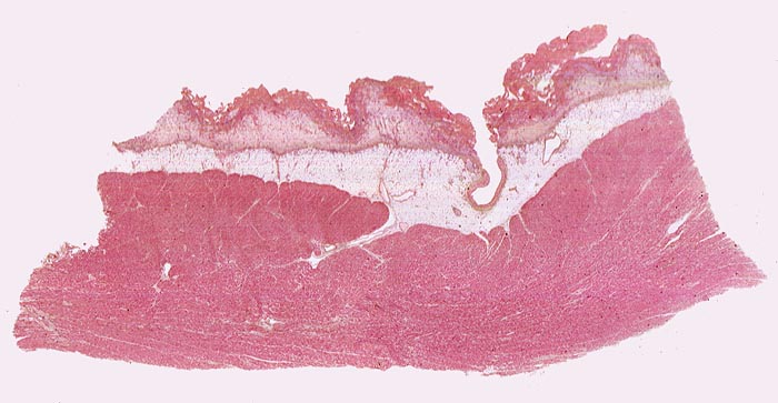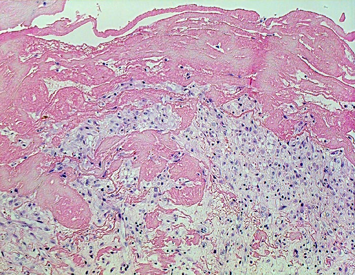 • Daran angrenzend ödematöse Granulationsgewebszone mit Histiozyten, Fibroblasten und Gefässen (Organisation des Fibrins).