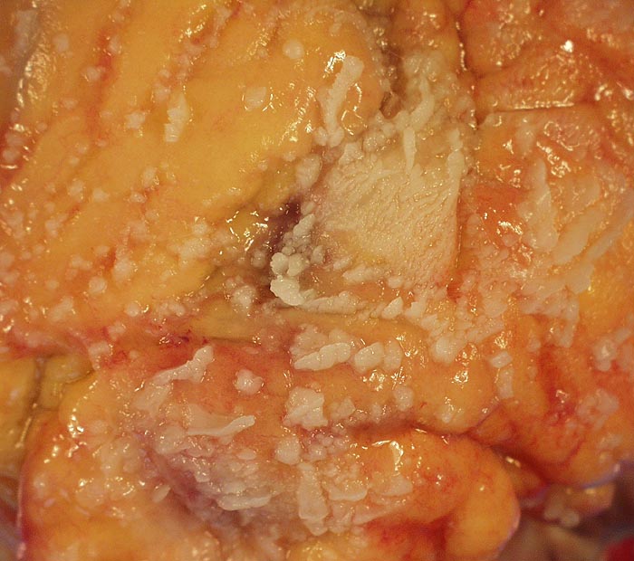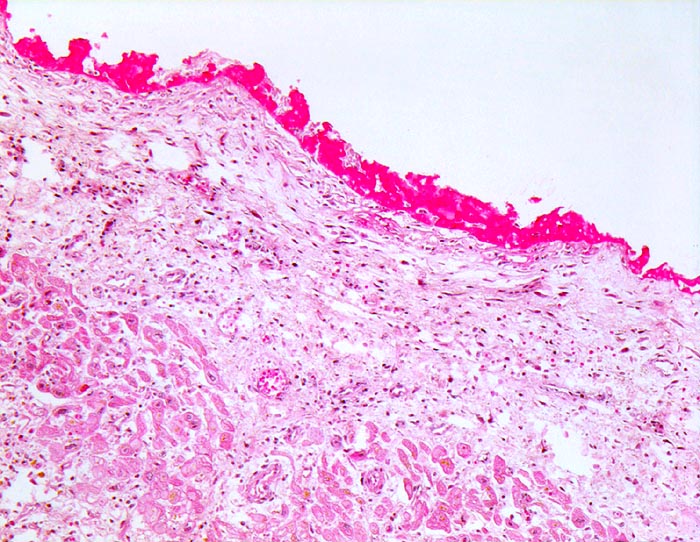 • Dem epikardialen Fettgewebe aufgelagerte zottenförmige Fibrinfäden.