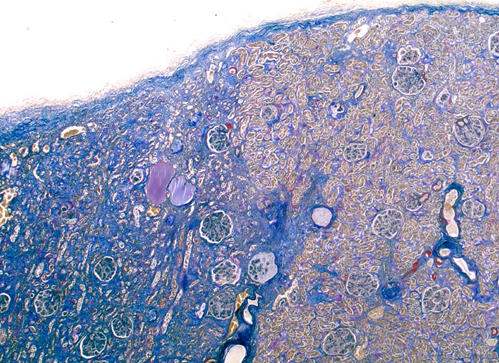 Morphologie: Makroskopisch feingranulierte verkleinerte Niere.