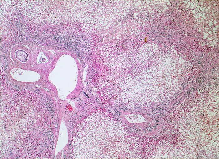 Floride sklerosierende alkoholische Steatohepatitis: Grobtropfige Verfettung von ca. 50% des Parenchyms.Neutrophile Granulozyten umgeben einzelne Hepatozyten (Satellitose). Wenig Apoptosekörperchen. Zahlreiche Mallory Körperchen und Megamitochondrien. Perivenuläre Maschendrahtfibrose.