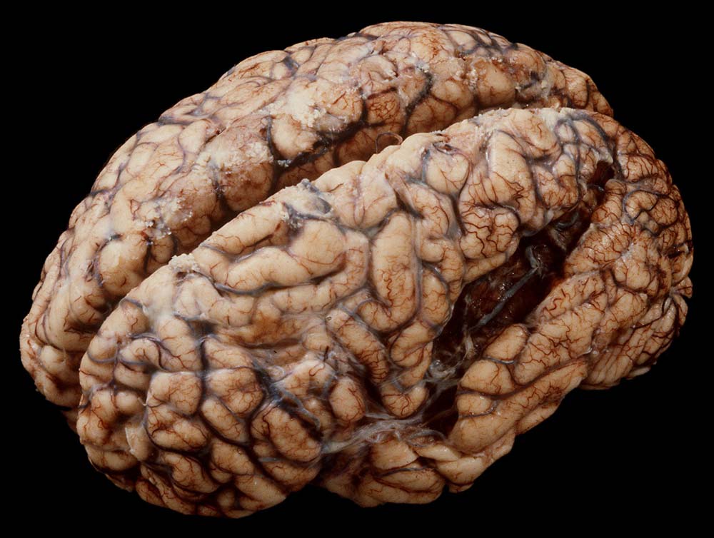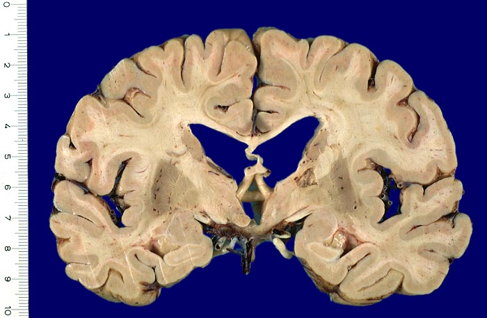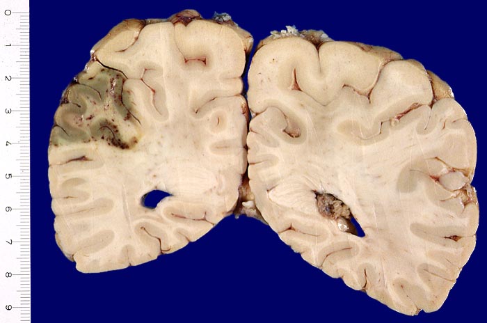 • Organisation und Zystenbildung (ab 1-8 Wochen): Übergänge zum Stadium 2 sind fliessend. Vermehrung von Fettkörnchenzellen rund um proliferierte Kapillaren. Endstadium des anämischen Infarktes bildet ein zystischer Parenchymdefekt, im Gegensatz zu anderen Organen (Herz, Niere) findet kein narbiger Umbau statt. Die in der deutschsprachigen Literatur oft erwähnte "Hirnnarbe" bezieht sich auf die reaktive Gliose im Randbereich des Infarktes. Eine reaktive Gliose ist unspezifisch und findet sich in der Nachbarschaft verschiedener Läsionen (beispielsweise Blutungen, Tumoren, Abszesse etc.). Alte abgebaute Infarkte sollen makroskopisch von alten Kontusionsherden abgegrenzt werden. Diese befinden sich praktisch ausschliesslich in frontobasaler oder temporobasaler Lokalisation (> 1436), wo umschriebene Hirninfarkte nicht vorkommen.