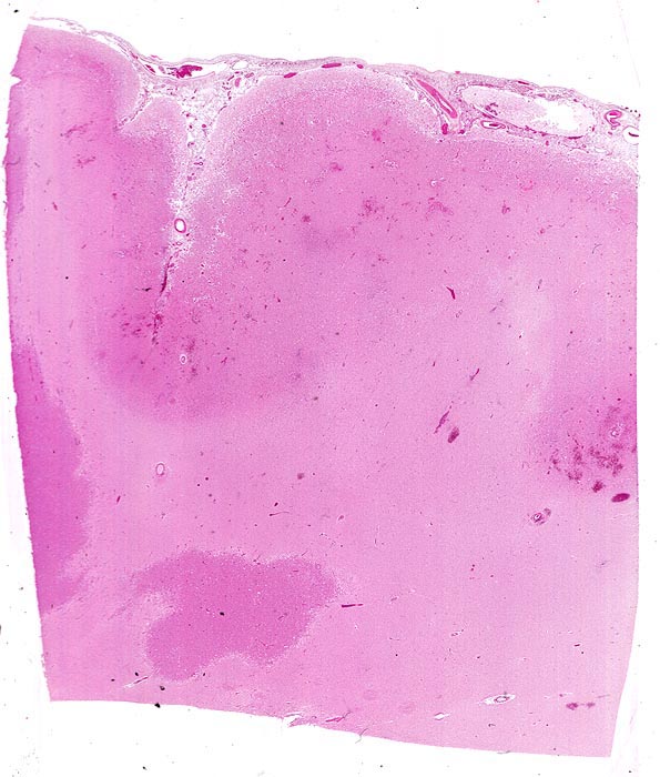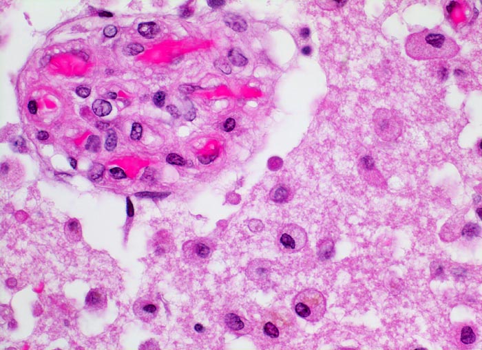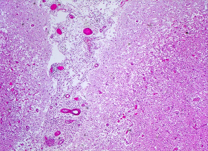 • Resorption und Abräumung (ab 5. Tag, vorliegender Fall): Mit zunehmendem Alter des Infarktes wird das Gewebe weicher und zerfällt innerhalb einiger Wochen zerfliessend kleinzystisch (Kolliquationsnekrose). Mikroskopisch ab dem zweiten Tag Auftreten von Makrophagen im Randbereich. Durch Phagozytose von Myelinbruchstücken lipidhaltige Vakuolen im Zytoplasma der Makrophagen (=Fettkörnchenzellen). Nervenzellen im Randbereich der Nekrose können das Bild einer ischämischen Schädigung zeigen (Hypereosinophilie). Gefässproliferation. Perifokale Gliose.