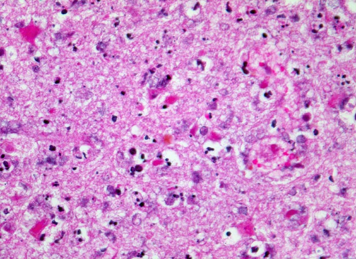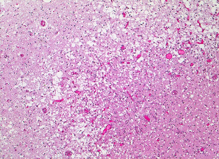 • Spongiotische Auflockerung der Hirnrinde (hellere Areale).