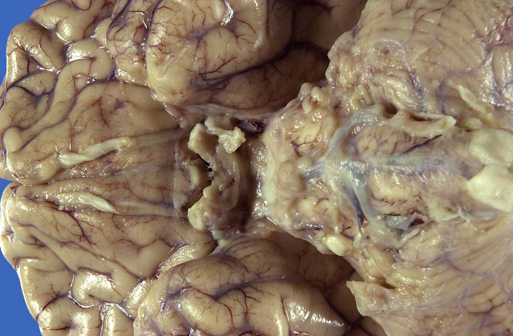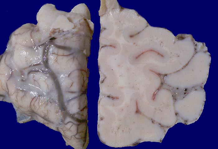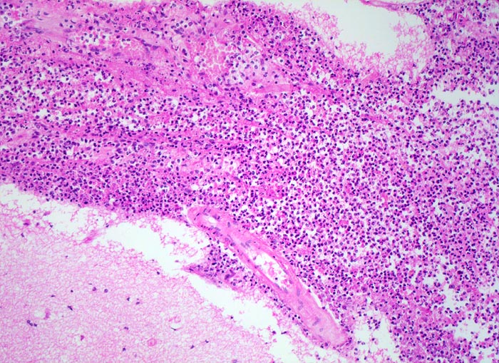 Der makroskopische Befund bei bakterieller Meningitis kann sehr diskret sein. Die meningealen Gefässe sind hyperämisch und die Hirnoberfläche wird von einem grüngelben Eiterbelag bedeckt (eher basal bei Hämophilus influenzae, eher über der Konvexität bei Pneumokokken=Haubenmeningitis). Histologisch ist der Subarachnoidalraum mit Eiter gefüllt. Bei weniger schweren Fällen finden sich die neutrophilen Granulozyten bevorzugt um die leptomeningealen Gefässe.