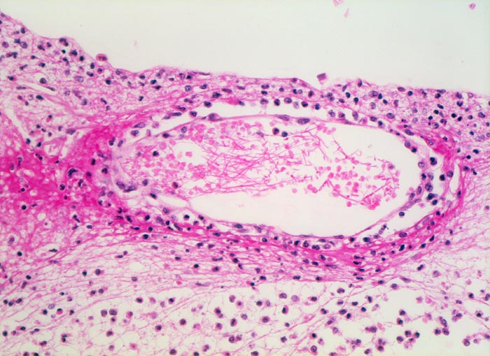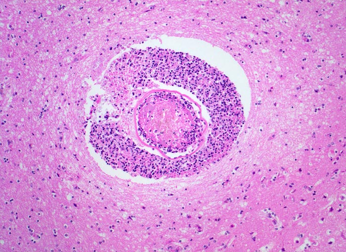 Ein Teil der leptomeningealen Gefässe zeigt eine fibrinoide Nekrose der Gefässwand.