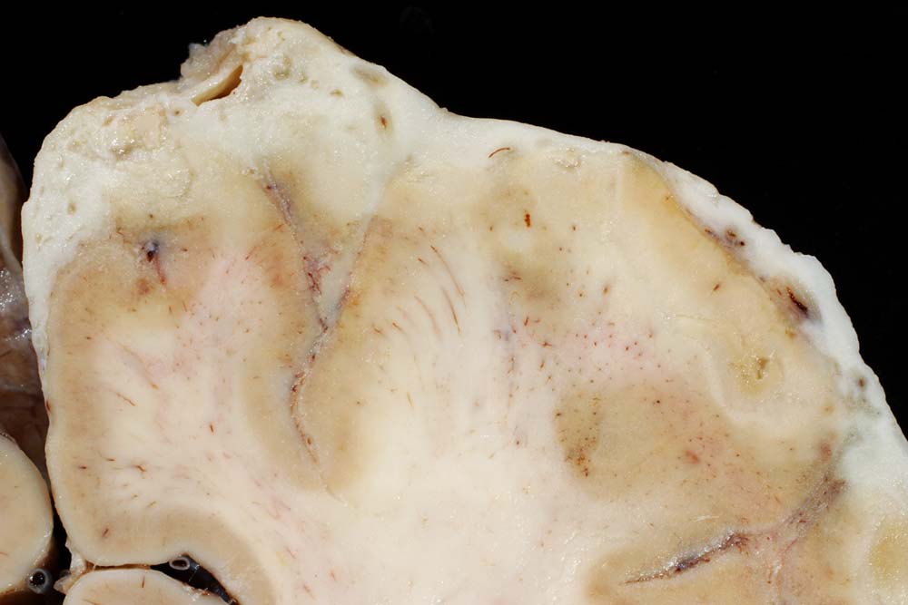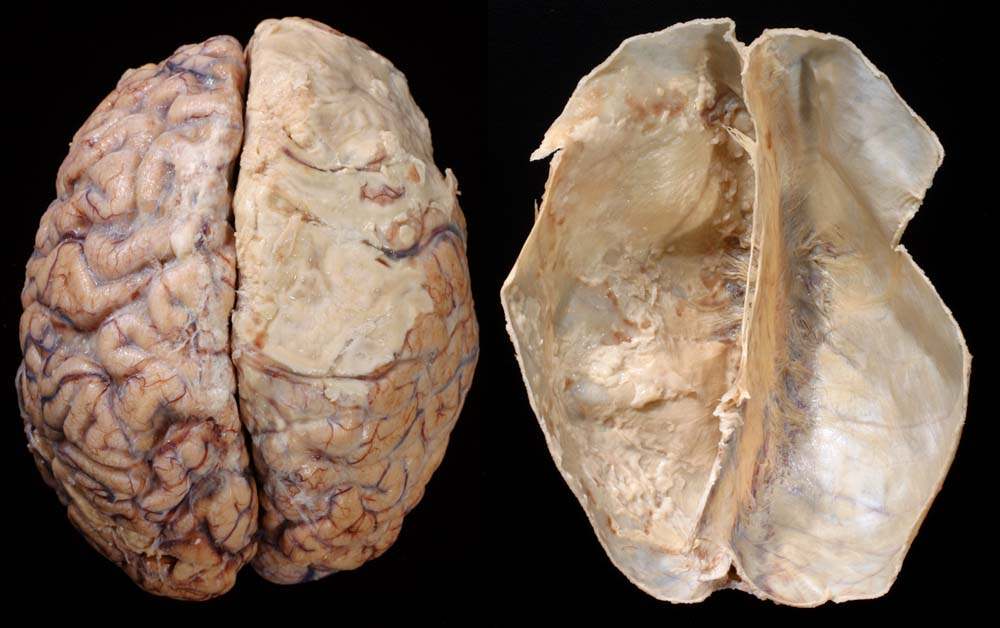 Der verbreiterte Subarachnoidalraum ist mit Eiter und Ödemflüssigkeit ausgefüllt.