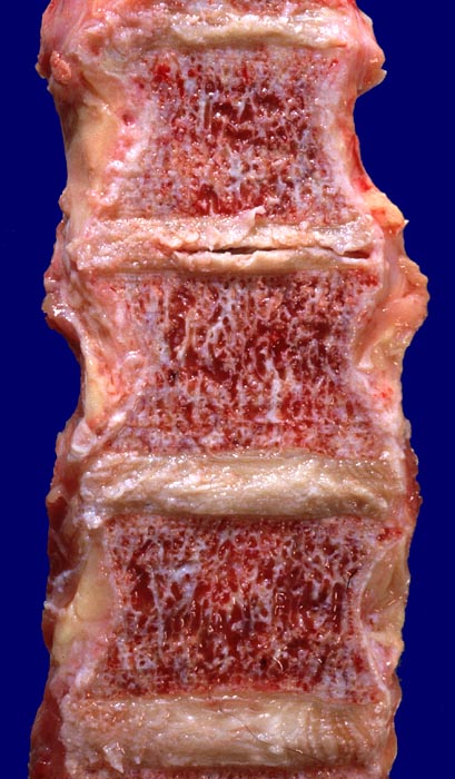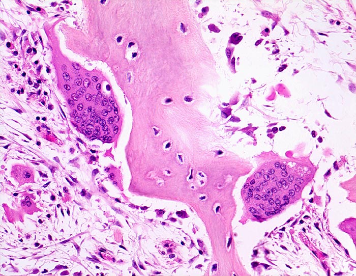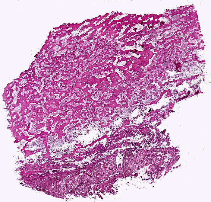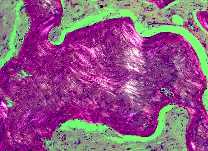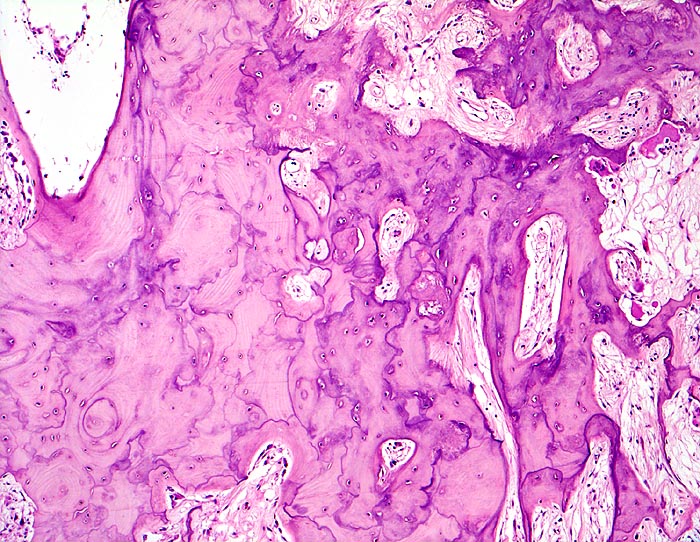 An den betroffenen Stellen ist sowohl der Knochenabbau als auch der Knochenanbau gesteigert. Die Osteoklasten sind auffallend gross und enthalten sehr viele Kerne ( 3518). Die aktivierten Osteoblasten produzieren verdickte und grob geflochtene Spongiosabälkchen. Der neugebildete Knochen ist strukturell und morphologisch abnorm und schlecht mineralisiert. Der Knochen wird dadurch weich und anfällig auf Frakturen oder Deformation unter Belastung (nach vorne gebogene Säbelscheidentibia). Das Knochenmark wird ersetzt durch fibrovaskuläres lockeres Stroma, welches an Granulationsgewebe erinnert. Mikroskopisch werden eine osteolytische Initialphase, eine Umbauphase mit verstärkter Knochenneubildung und eine sklerosierende Stabilisationsphase mit strukturellem Umbau und Spongiosierung der Kortikalis (verbreiterte spongiosaartige Kortikalis) unterschieden.