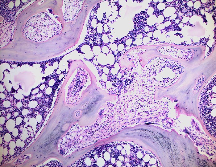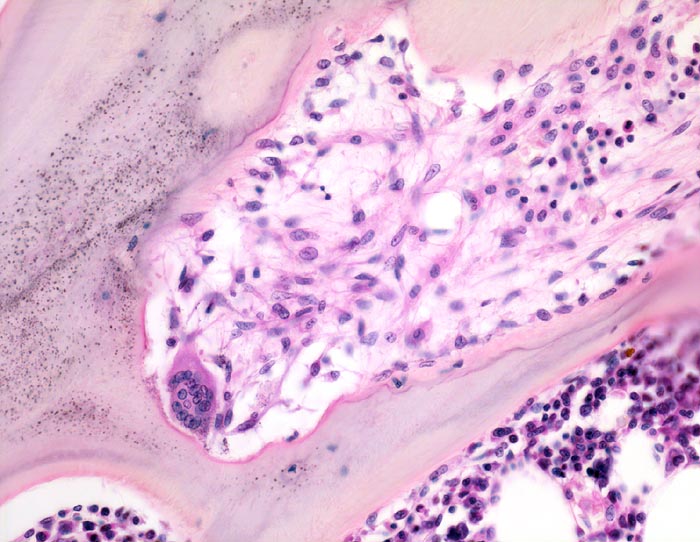 Histologisch findet sich beim Hyperparathyreoidismus eine gesteigerte Osteoklastentätigkeit mit Tunnellierung der Knochenbälkchen und gleichzeitig eine gesteigerte Knochenneubildung mit Fibrose der peritrabekulären Markräume. Die Maximalvariante eines sogenannten „Braunen Tumors“ -Osteodystrophia fibrosa generalisata cystica von Recklinghausen- kommt heute in Mitteleuropa praktisch nicht mehr vor. Die braune Farbe dieses Tumors wird durch sekundäre Einblutungen und Siderinablagerungen verursacht.