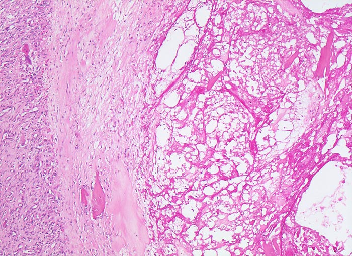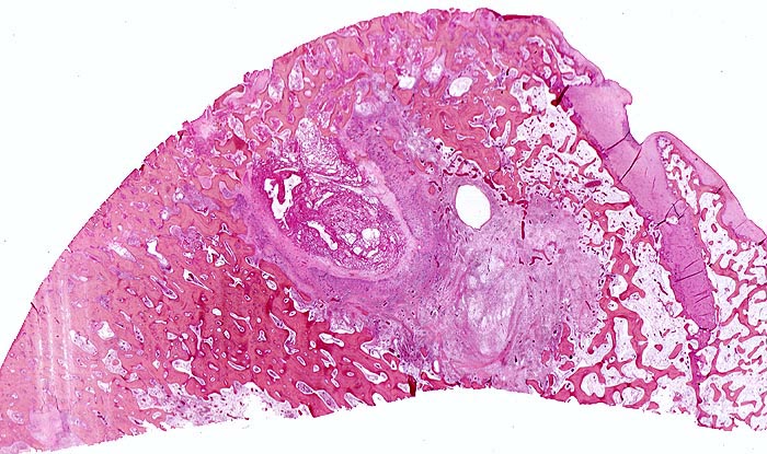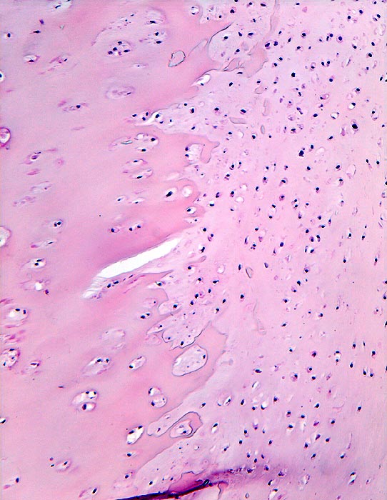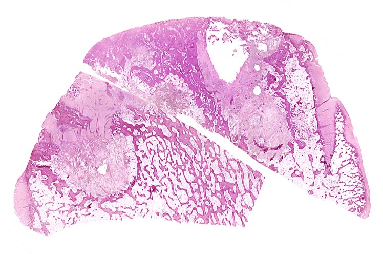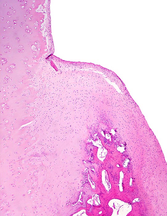 Der progrediente Knorpelverlust führt zum Freiliegen der knöchernen Deckplatte. Der subchondrale Knochen antwortet mit einer elfenbeinartigen Sklerose in Arealen vermehrter Belastung (=Eburnisation). Der traumatisierte subchondrale Knochen kann als Folge einer Knochennekrose pseudozystisch degenerieren (Geröllzystenbildung). Am Rand des Knochens, ausserhalb der Belastungszonen bilden sich irreguläre Knochenneubildungen (Randosteophytenbildung ev. mit Verdoppelung des Gelenkknorpels). Fragmentierungen dieser Osteophyten oder des Gelenkknorpels führen zu intraartikulären freien Körpern (=Gelenkmäuse) und einer Detritussynovialitis ( 1146)( 1038)( 539).
