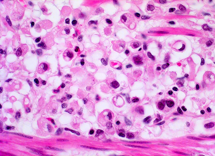 • Ein Grossteil des Tumorinfiltrats besteht aus einzeln oder in kleinen Gruppen liegenden Zellen mit intrazytoplasmatischen Schleimvakuolen, die teilweise den Kern verdrängen (Siegelringzellen): diffuser Typ des Magenkarzinoms nach Lauren.