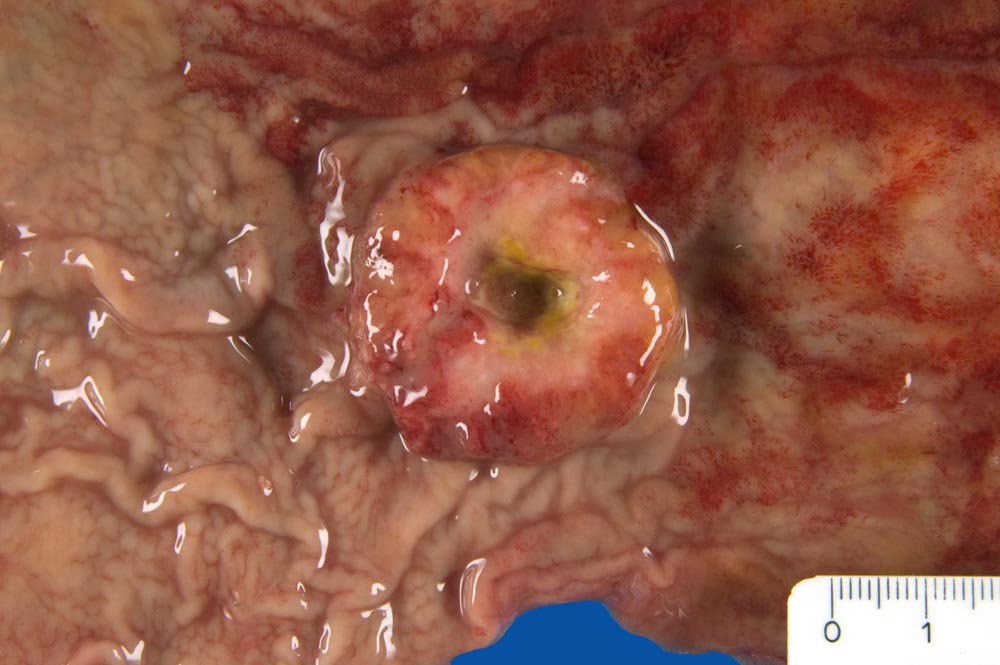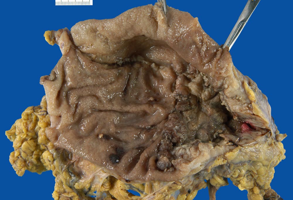 Makroskopisch können nach Borrmann (> 5050) polypoide Tumoren, ulzerierte Tumoren mit Randwall, ulzerierte Tumoren mit Invasion der Magenwand und diffus infiltrierende Tumoren (=Linitis plastica (> 3315)) unterschieden werden.