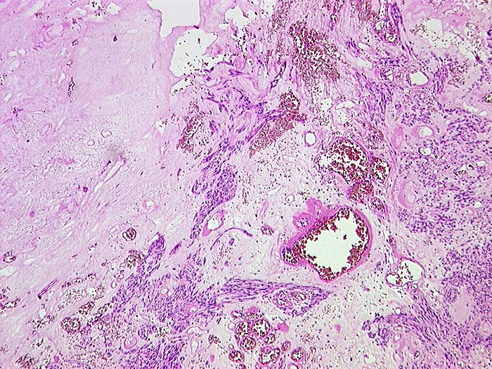 Spindelzelliger Tumor. Grössere degenerative praktisch zellfreie Sklerosezonen mit grösseren Gefässen und Zystenbildung.