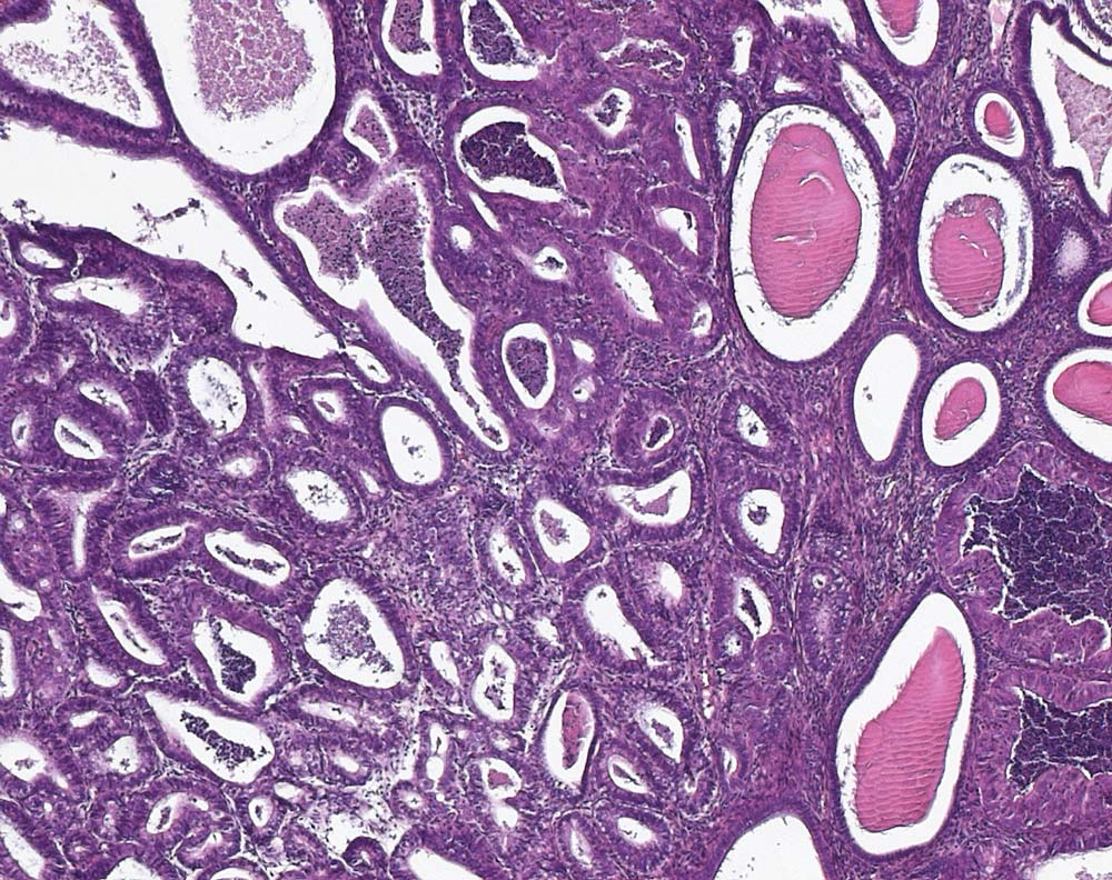Endometriale intraepitheliale Neoplasie: Umschriebener Herd sehr dicht beeinanderliegender Endometriumdrüsen ausgekleidet von atypischem Epithel, welches sich zytologisch deutlich vom Epithel der nicht neoplastisch transformierten Drüsen unterscheidet. Im Gegensatz zum endometrioiden Adenokarzinom ist zwischen den Drüsen der EIN noch wenig Stroma erkennbar.
