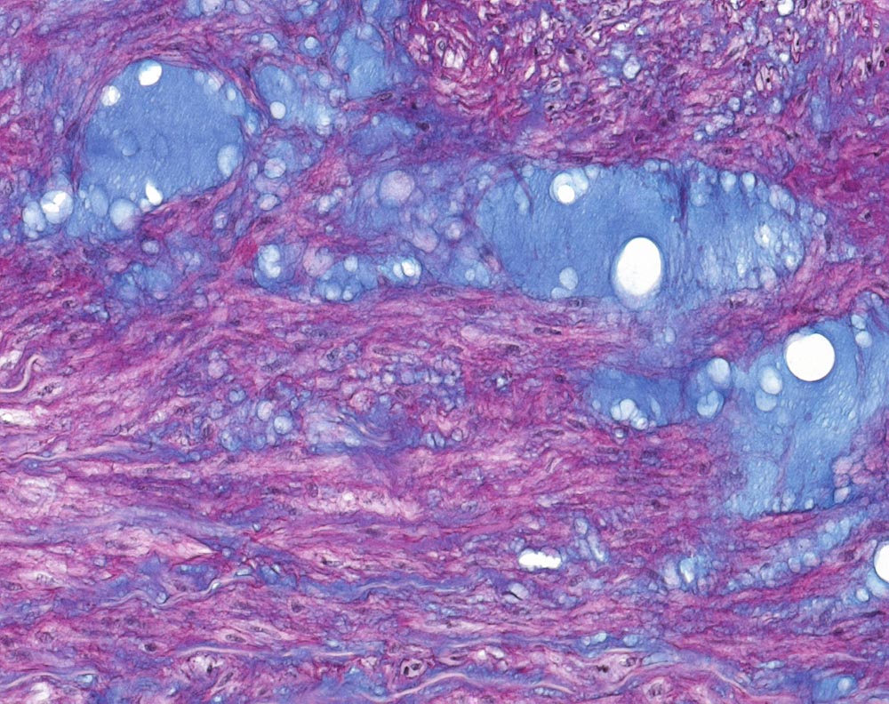 Fragmentierung der elastischen Fasern der Aortenmedia mit Ausbildung von zystenartigen Räumen. Die Elasticalücken sind gefüllt mit Alzianblau-positivem proteoglykanreichem mukoidem Material. Keine Entzündung.