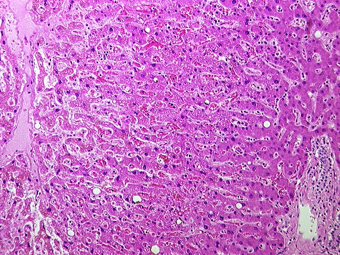 Links eine Zentralvene, rechts ein Portalfeld. Die Sinusoide sind vor allem um die Zentralvene erweitert und die Leberzellplatten leicht verschmälert (Druckatrophie).