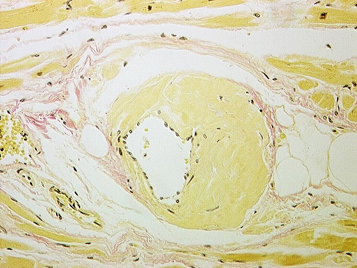 Azelluläre schollige gelbe Ablagerungen in einem intramyokardialen Gefäss.