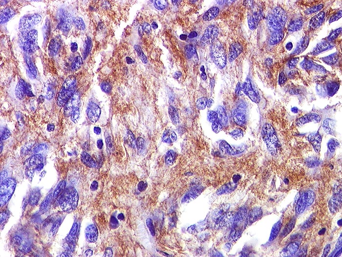 Spindelzelliger Tumor mit deutlichen Zellatypien. Das Zytoplasma der Tumorzellen reagiert positiv mit CD 117.