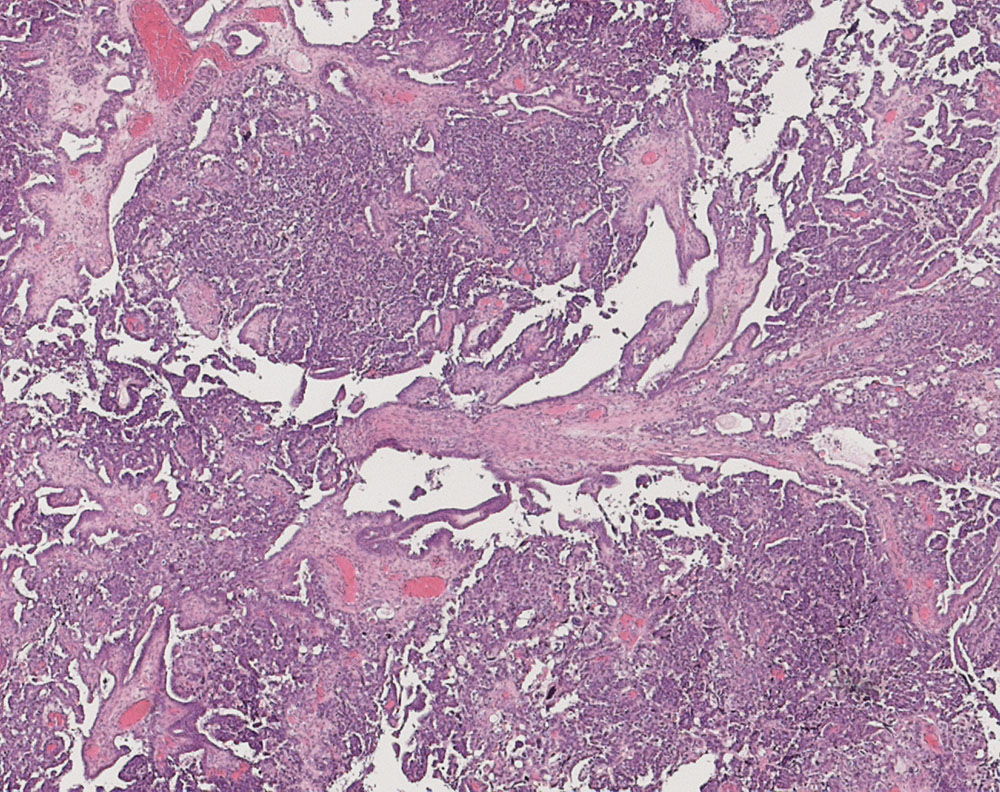 Papillärer Tumor. Drüsen mit schlitzförmigen Lumina.