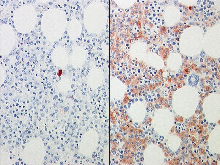 Starke monoklonale Vermehrung von Plasmazellen, welche Lambda Leichtketten exprimieren. Im gleichen Knochenmarkausschnitt links nur gerade eine Kappa Leichtketten exprimierende Plasmazelle.
