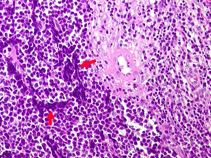 Rechts im Bild Reste des Lymphknotengewebes mit einem bunten Gemisch verschiedenartiger Zellen. Links im Bild die im Vergleich mit Lymphozyten wenig grösseren nacktkernigen Tumorzellen mit typischen ► Quetschartefakten.