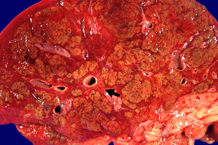 erhaltenes Leberparenchym mit roten Stauungsstrassen erkennbar.