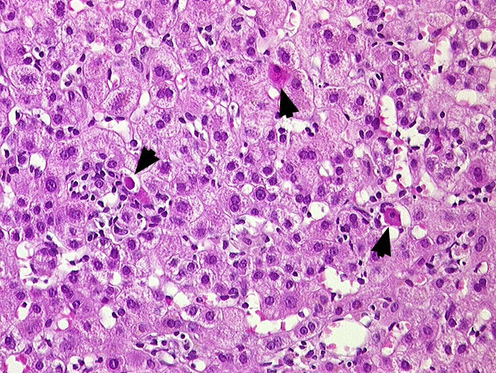 PathoPic ID 1164 - akute Hepatitis C Infektion mit Einzelzellnekrosen