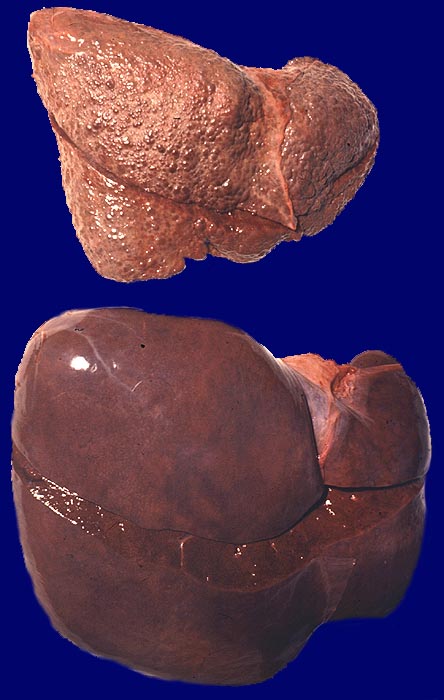Oben die verkleinerte zirrhotische Leber mit feinhöckriger Oberfläche. Unten normale Leber mit glatter Oberfläche.